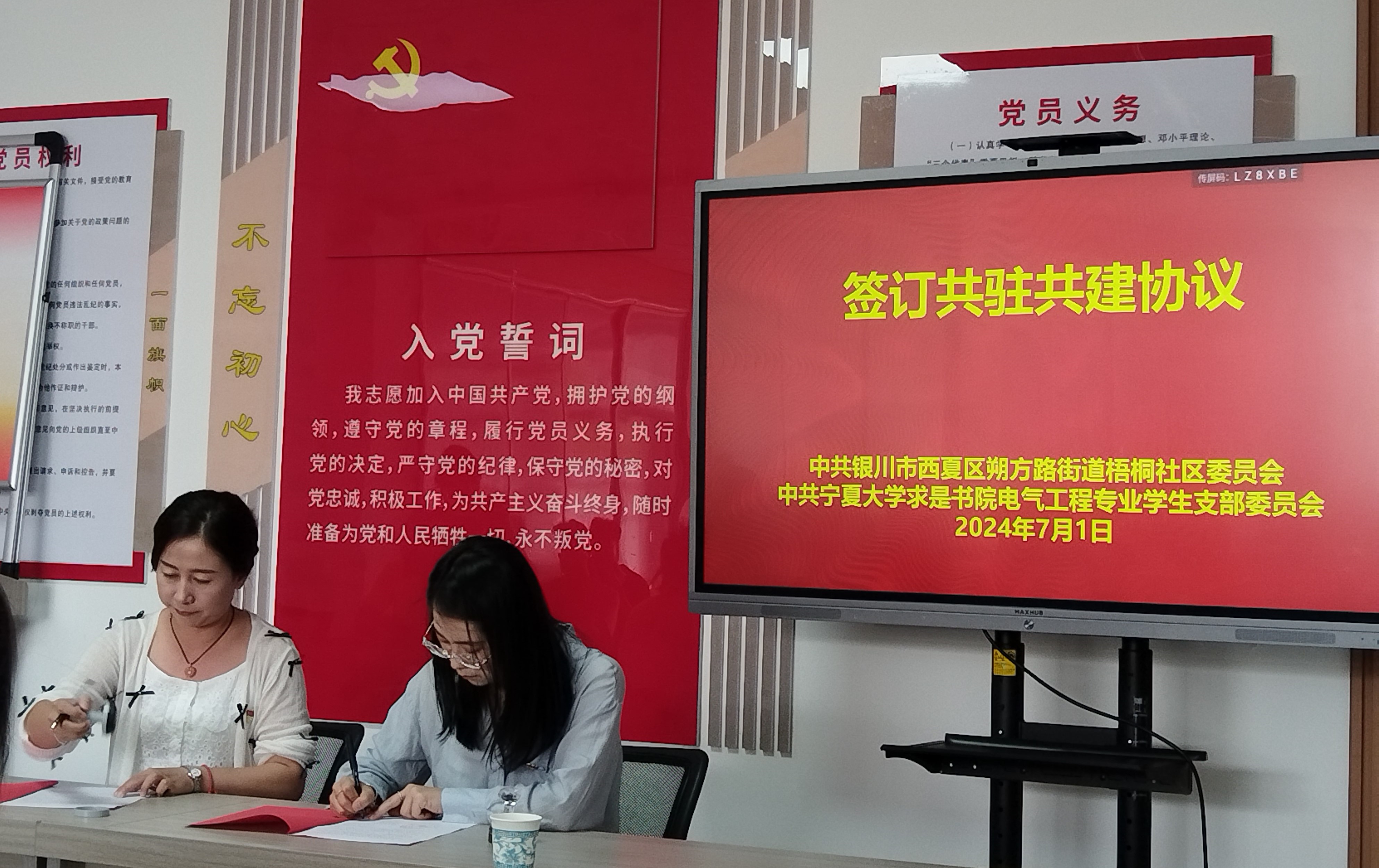 座谈中围绕“以科技为引领,高效融入社区基层治理”主题,就校社党建联动“共建•共融•共享”进行座谈交流,双方表示在党员教育培训、志愿服务活动、科学普及等方面展开深入合作,不断丰富校社协同合作内容,共同探索校社党建发展新路径,构建起高校长效服务社区机制,引领学生深入基层一线,强化责任意识,提升使命担当。求是书院电气工程专业学生党支部与梧桐社区党委现场签订了共驻共建协议书。