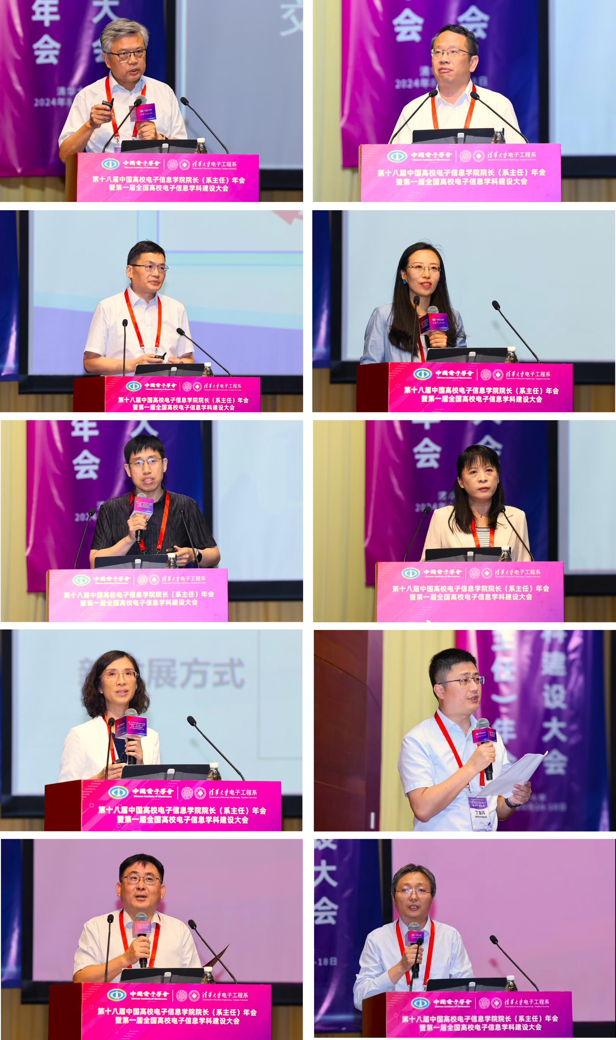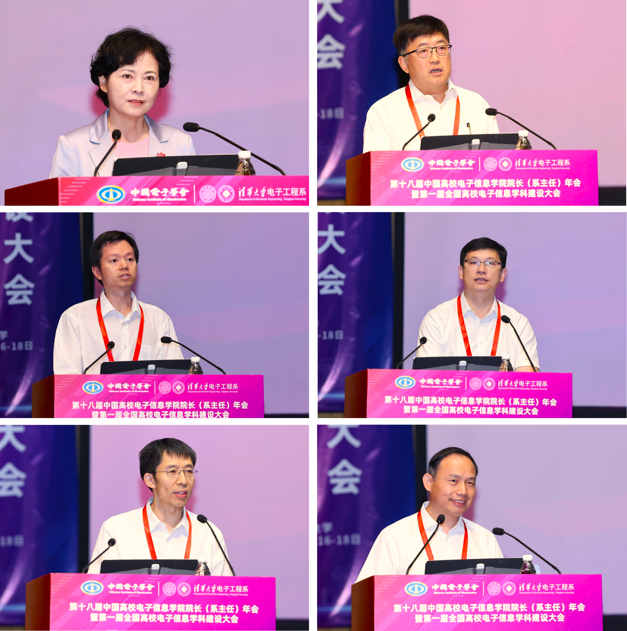 主论坛上中国新一代人工智能发展战略研究院执行院长、南开大学电子信息与光学工程学院教授龚克,北京邮电大学校长徐坤,西安电子科技大学校长张新亮,北京市海淀区人民政府副区长唐超,北京航空航天大学副校长、中国卓越工程师培养联合体秘书长赵巍胜,清华大学学术委员会副主任黄翊东,中国移动通信研究院院长黄宇红,分别以《绿色化数字化双重转型中的电子信息学科发展》《面向数字经济时代的电子信息学科人才培养实践与思考》《电子信息类高校优势学科建设的探索与实践》《构建繁荣区域协同创新生态,全力加速高校院所成果转化》《产教融合、数智赋能 推进高质量人才培养》《电子信息课程体系改革思路与实践》《把握趋势、勇担使命,深入推动产教融合的实践与思考》为主题做大会报告。