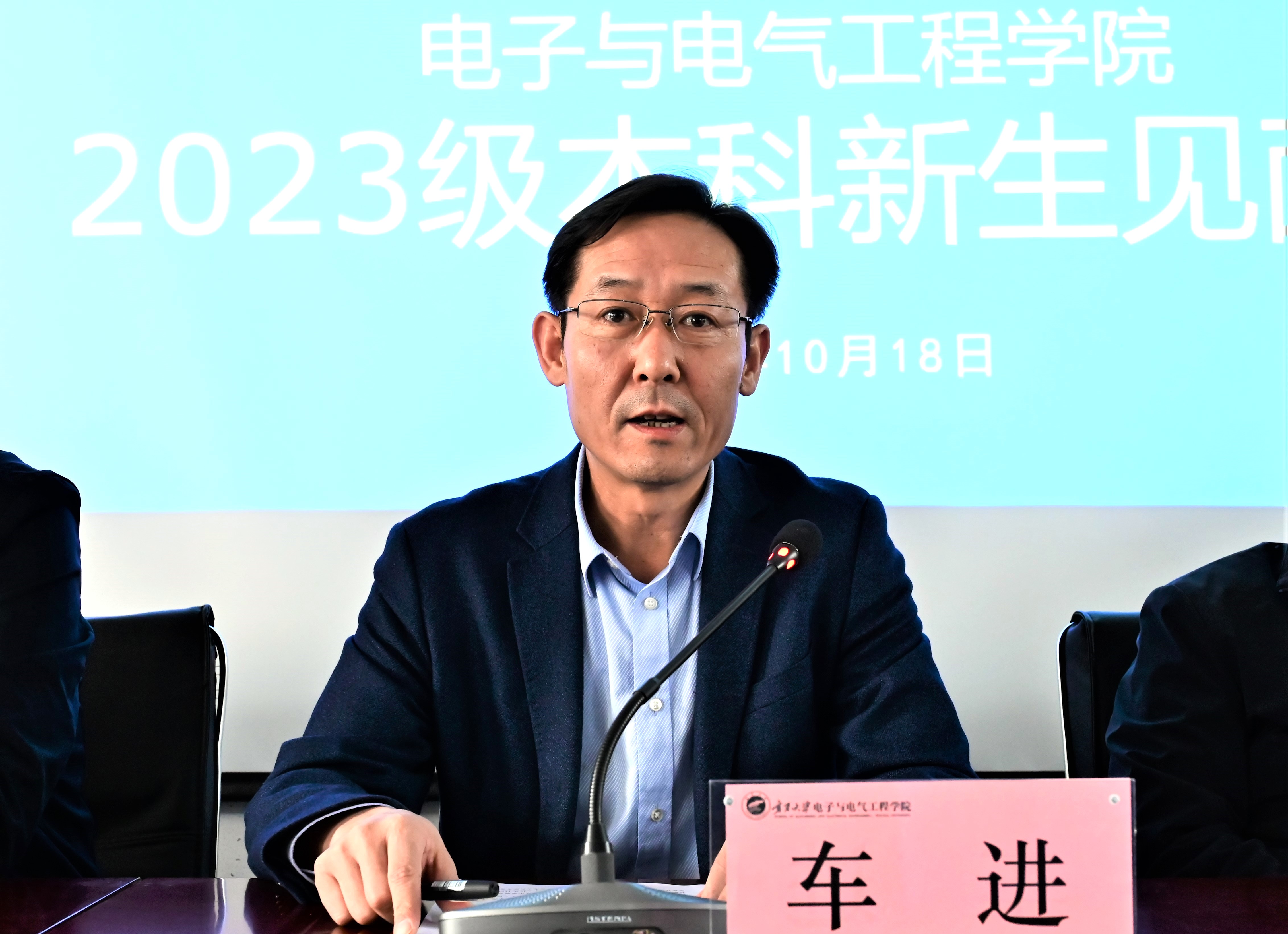 学院院长车进向同学们介绍了学院的建设和发展历程、师资力量、教学科研平台以及毕业生升学和就业情况,表示学院会竭尽全力助力同学们成长成材。他对同学们未来的学习规划进行指导,希望同学们多和学院专业老师沟通交流,在学习生活中亲身实践,奋力书写好自己在大学生活中的新征程。尽快适应从高中生到大学生的角色转变,认真规划自己的大学时光,四年大学学习学有所成,在电院圆梦。