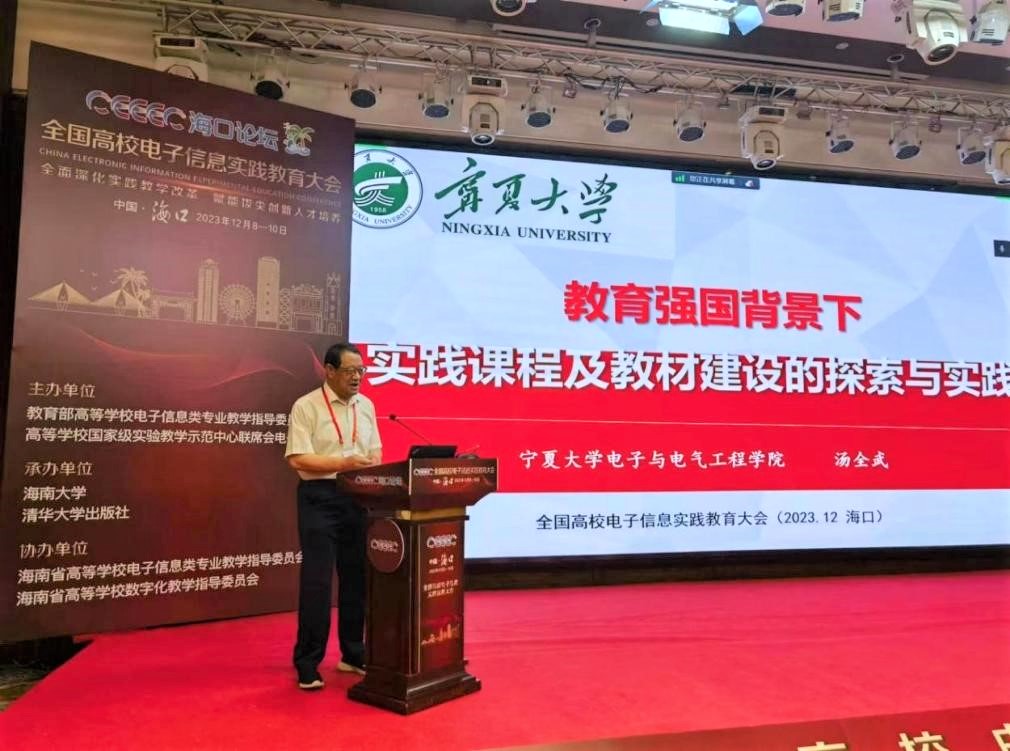电子与通信工程专业基础课教研室主任、宁夏高校专业类思政教材研究基地首席专家、秘书长、高等学校电路和信号系统教材与研究会常务理事、西北地区高等学校电工电子在线开放课程联盟理事、国家一流课程负责人汤全武教授受邀作了题为“教育强国背景下实践课程及教材建设的探索与实践”的大会报告。报告从建设背景与使命、实践课程建设、新形态教材建设、建设实践与成效四个方面作了阐述,分享了国家一流课程的建设经验,介绍了新形态教材建设的建设标准与评价指标、特点与优势,提出了“虚实结合,分层递进”的实验教学体系,以“OBE为导向”构建新目标,以“学为中心”打造新教材,以“学科实践”推进新教学,以“促进学习”开展新评价,总结了学院近年来积极响应新工科人才培养要求在实践教学和教材建设方面的经验与成果。其报告获得了与会专家和同行老师的高度赞誉。