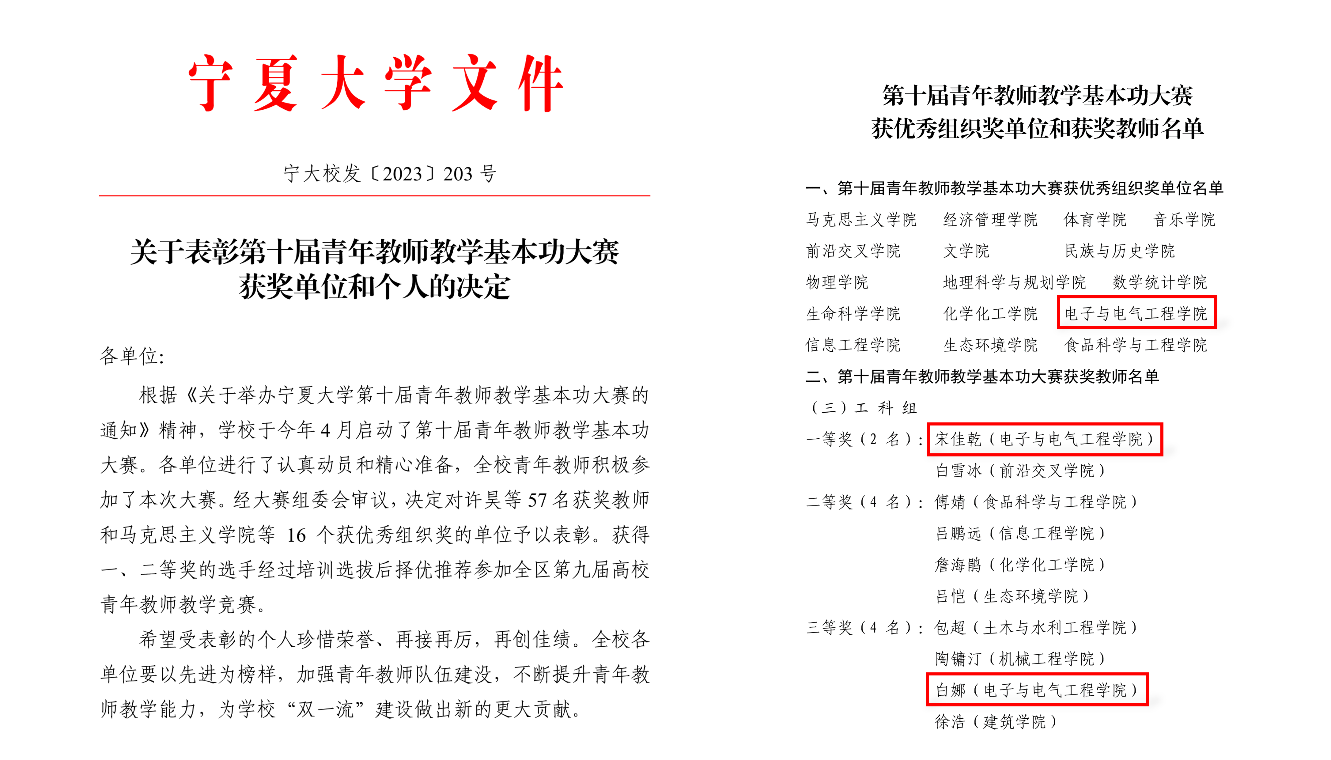 青年教师的优秀教学能力与风采:宋佳乾荣获一等奖,白娜荣获三等奖,学院荣获大赛优秀组织奖。
