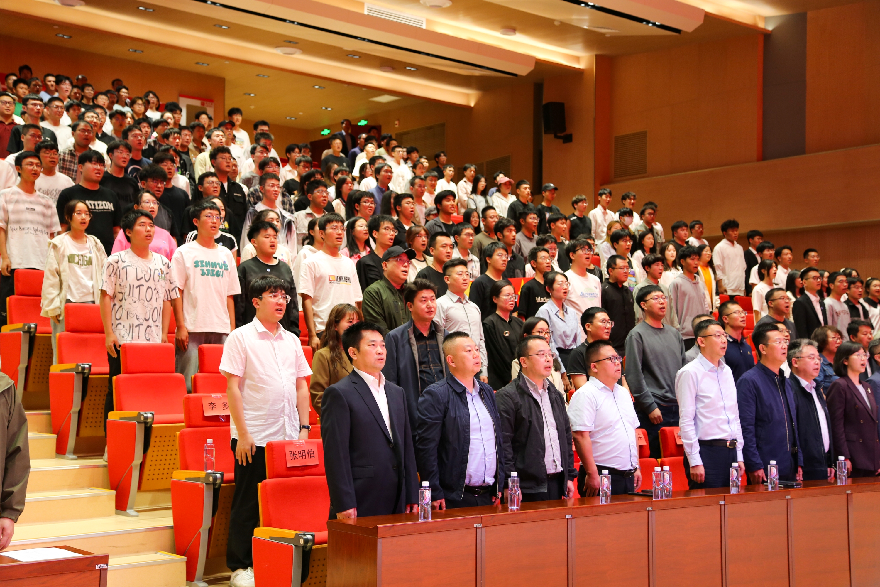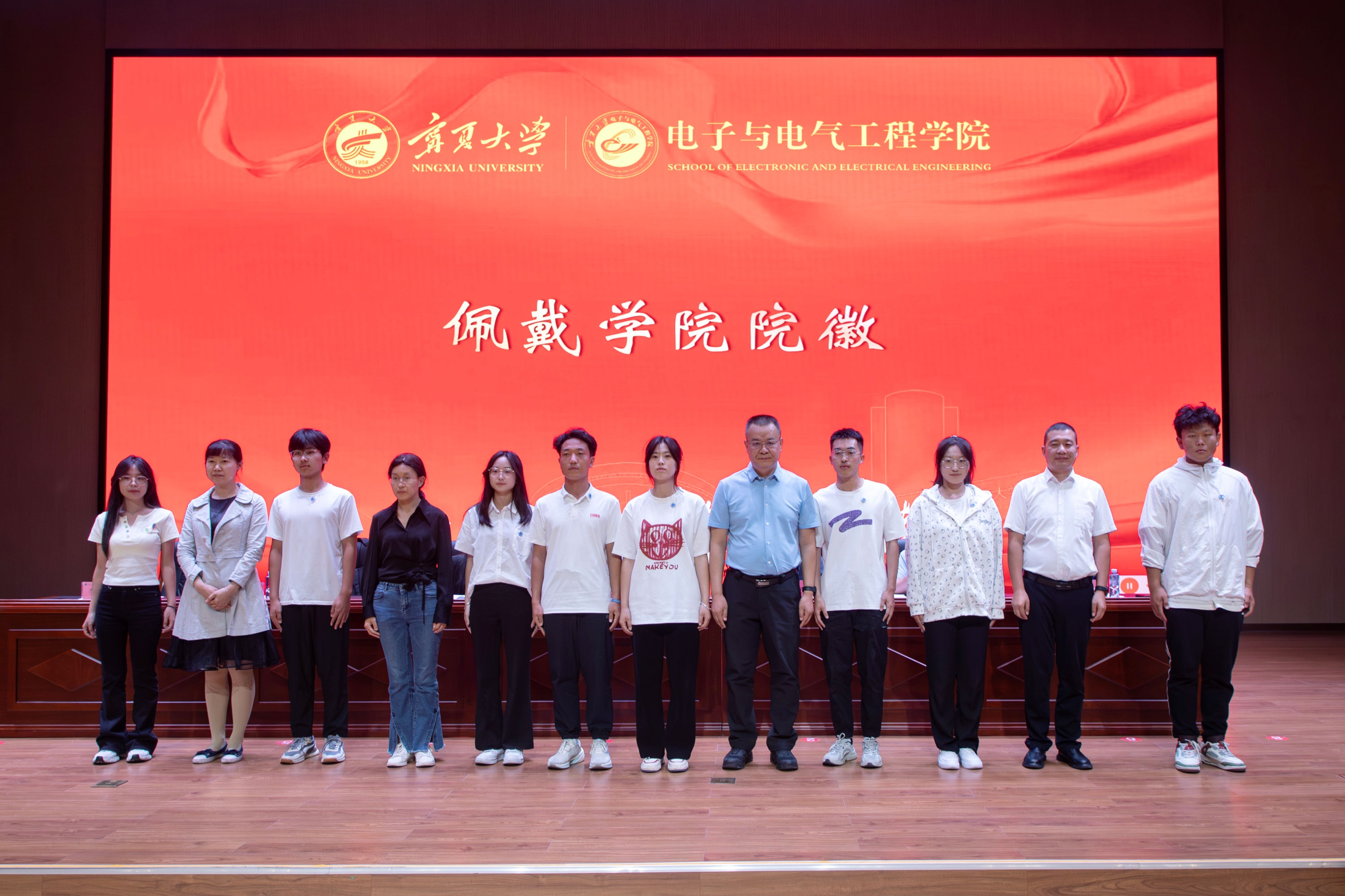 院徽。台下,新同学现场集体佩戴院徽。从此刻起,来自全国各地的新同学正式成为“电院人”。未来的学习生活中,学院将与同学们携手同行、着笔谱写属于新时代青年学子的青春篇章。