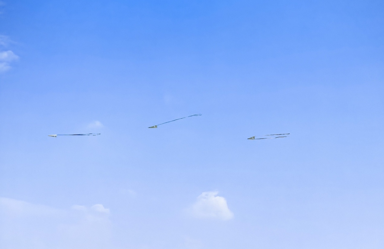 紧接其后三架外形逼真、动作矫健的歼-11战斗机纸飞机编队依次升空。它们以敏捷的爬升、精准的低空通场和连贯的穿云动作,在空中划出优美而充满力量的轨迹,将全场气氛推向高潮,彰显出Happy漫画