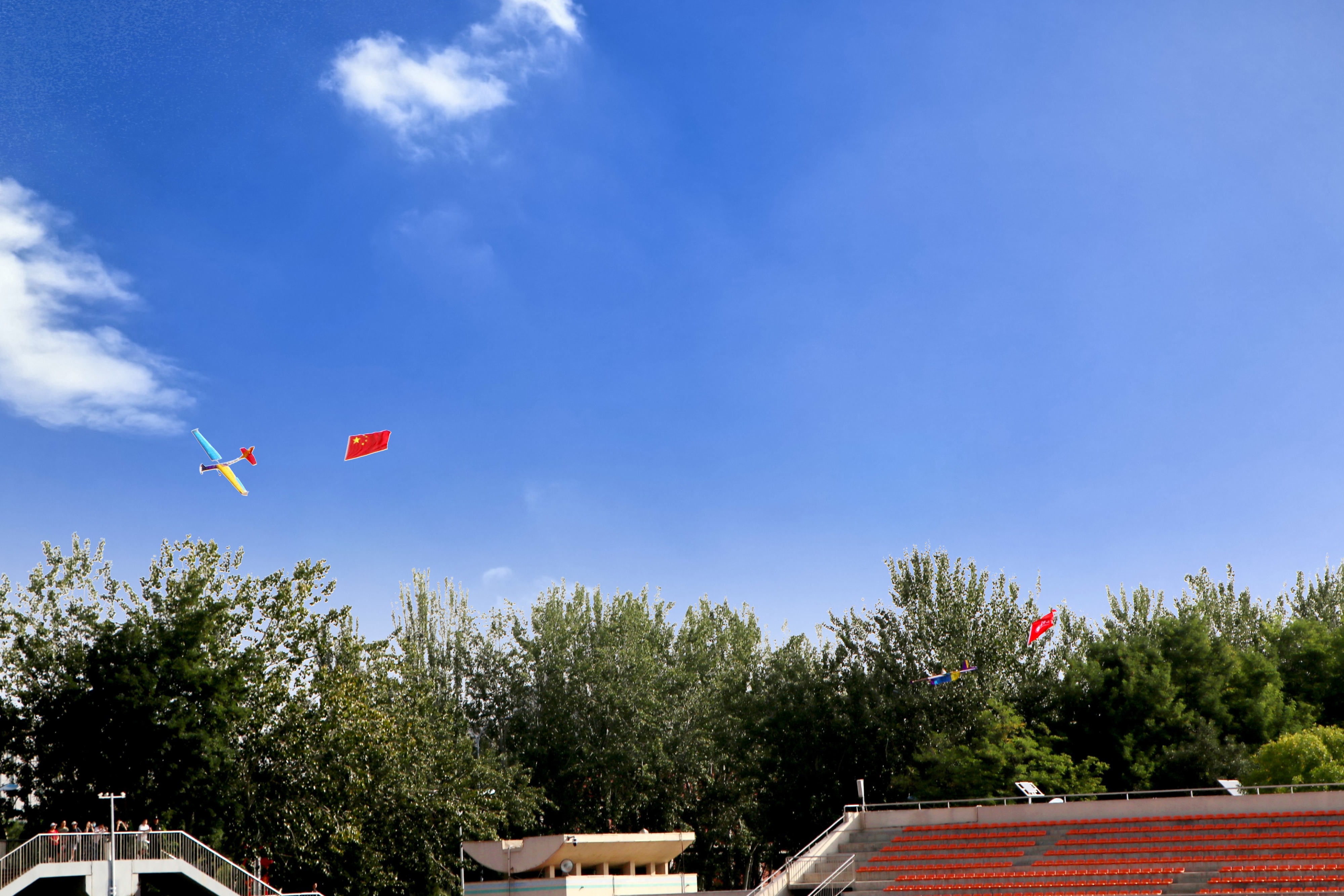 随着两架悬挂着中华人民共和国国旗和Happy漫画