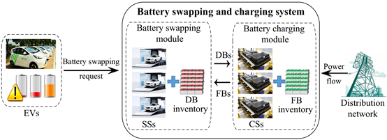 电池充换电系统(Battery Swapping and Charging System, BSCS)(如图2所示)是一种新兴的、具有发展前景的基础设置,能够为电动汽车提供能源补给服务。然而,考虑到BSCS中每个运营商(即电池换电模块运营商和电池充电模块运营商)都有隐私保护需求和个人利益偏好,这给BSCS的运营管理带来巨大挑战。为此,该论文从社会角度研究了BSCS的隐私保护运营管理问题,并对电池的完整换电-充电过程进行详细建模,并同时考虑了动态电池库存和充电电池荷电状态的演化过程(如图3所示)。针对不同运营商对隐私保护的要求以及连续决策变量与离散二元决策变量之间的强耦合问题,提出了一种创新的基于对偶的Benders分解算法,该算法具有以下两个优点:1)每个电池换电和充电模块运营商可以独立解决各自的充换电调度问题,从而保护了个体隐私;2)对偶分解和Benders分解技术的有效结合在实现并行计算、提高调度效率的同时,保证了算法的可扩展性。该研究成果为电动汽车的智能补能决策提供有效的理论指导,对缓解电网调控压力以及新能源汽车产业的发展具有重要的理论价值和现实意义。