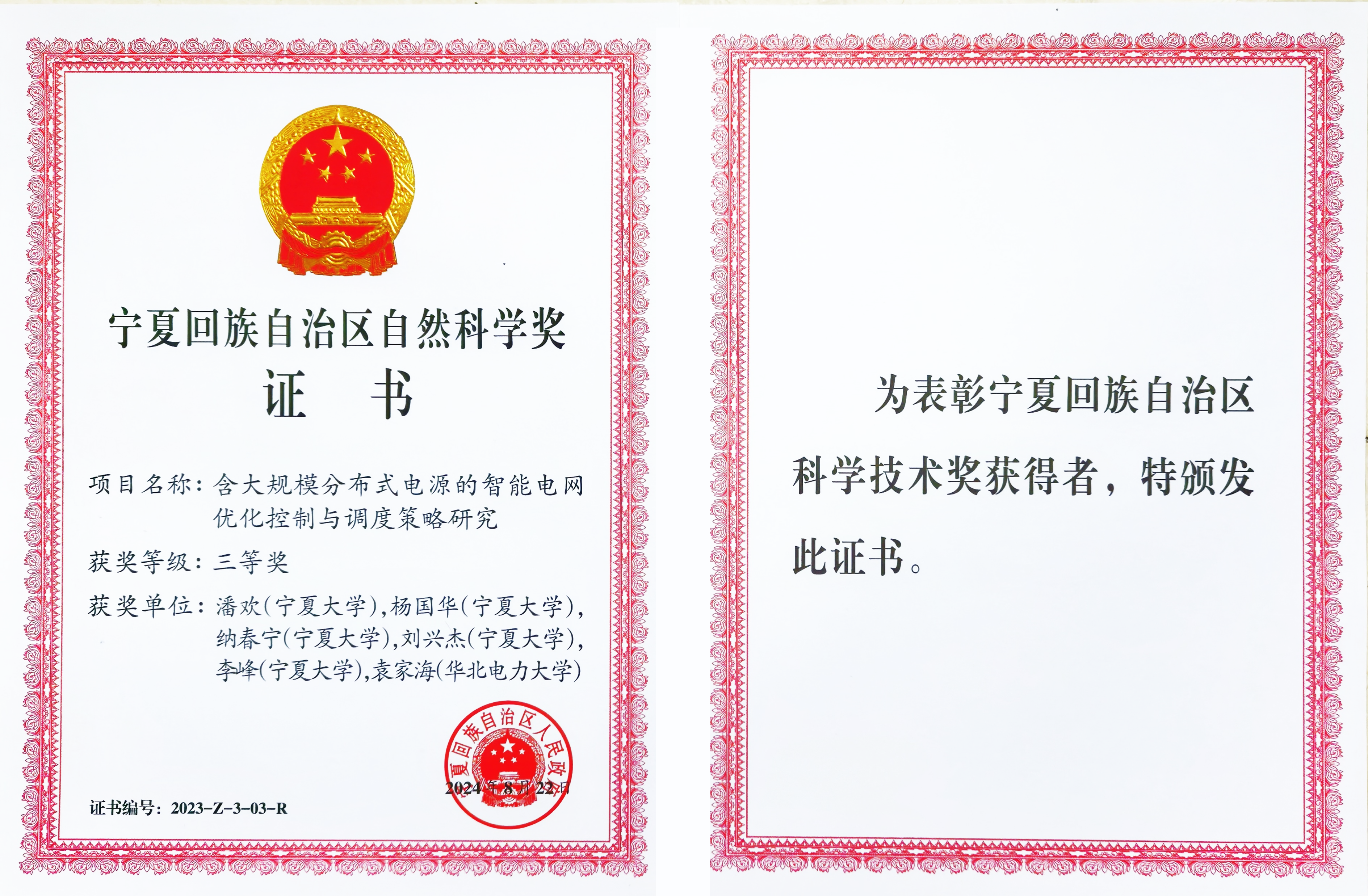 电气工程学科教师团队完成的《含大规模分布式电源的智能电网优化控制与调度策略研究》获得2023年度自治区自然科学奖三等奖。